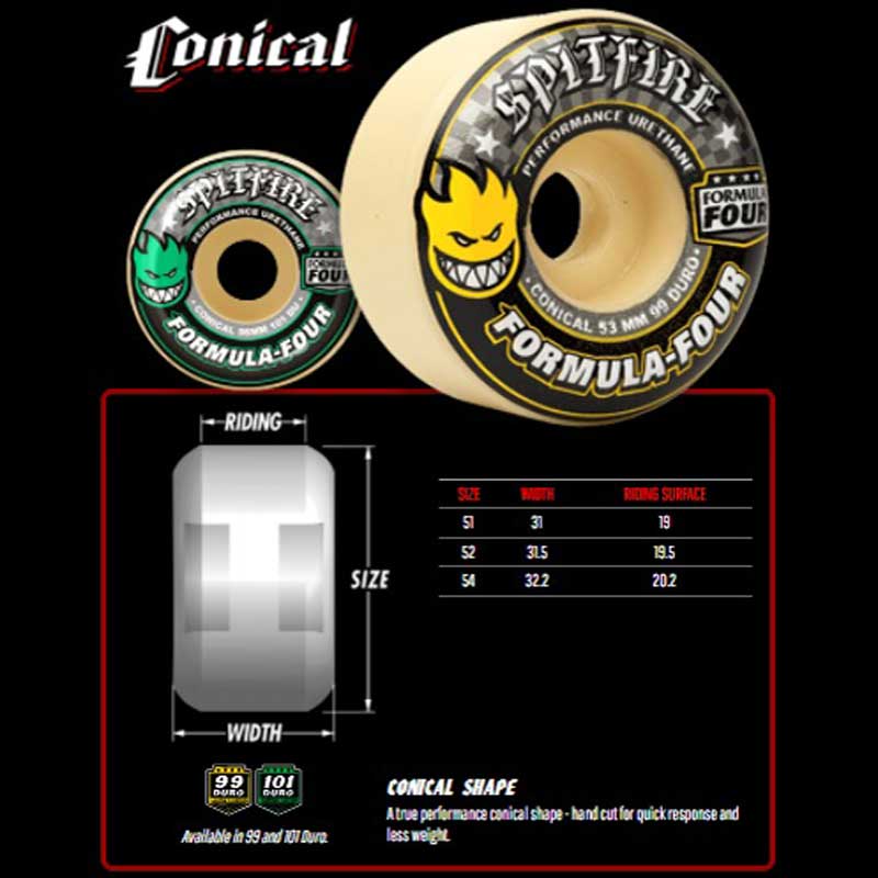 スピットファイアのF4ウィールです。磨耗しにくく、耐久性が高いウレタンを使用。幅と接地面を広くとりつつ、内側をえぐって軽量化したコニカルシェイプのモデルです。99Aの硬めです。