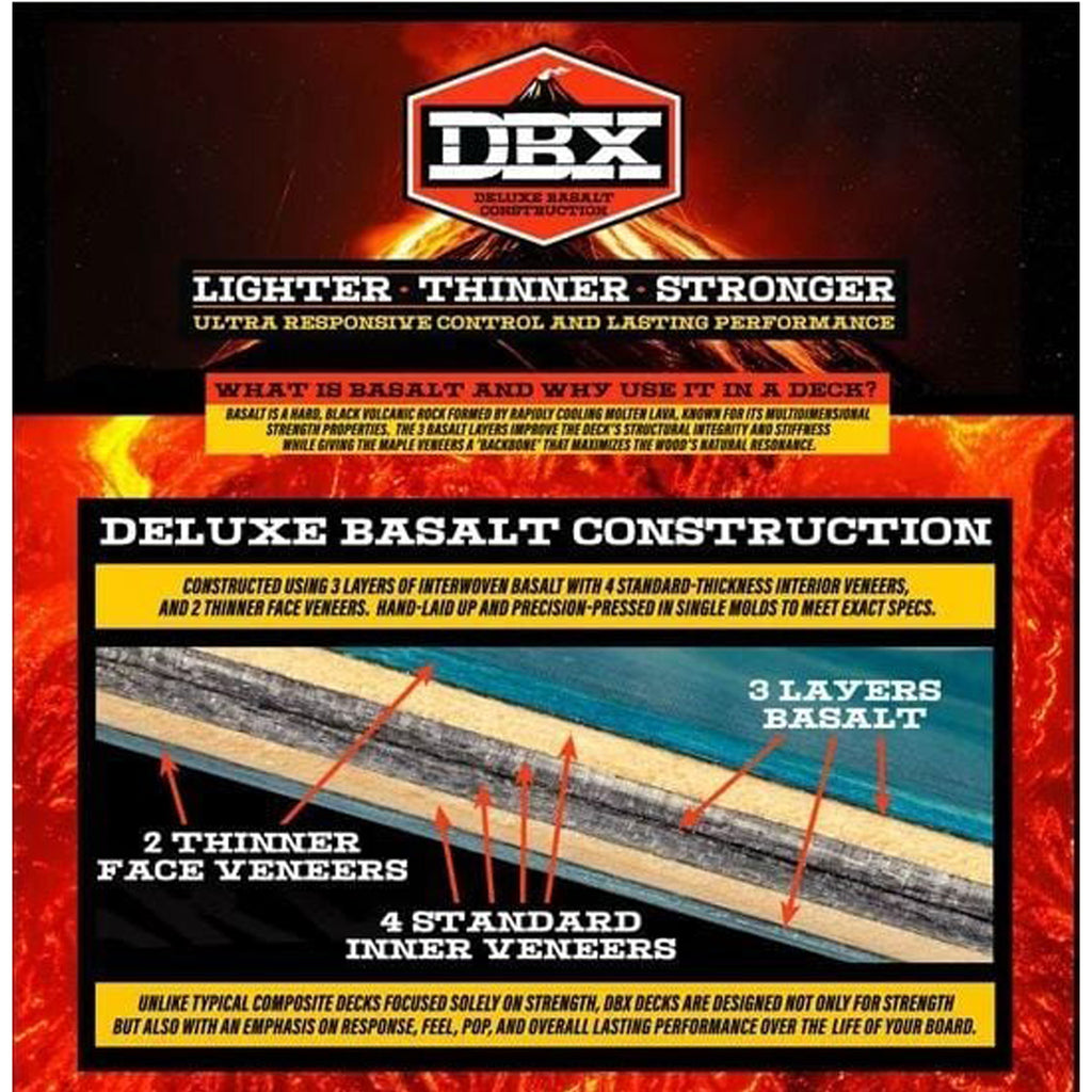 強度のみを追求する一般的な複合材デッキとは異なり、DBXデッキは強度だけでなく、レスポンス、フィール、ポップ、そしてボードの寿命にわたる総合的な耐久性能を重視して設計されています。3層の交差積層バサルトと、4枚の標準厚さの内側ベニア、2枚の薄い表面ベニアを用いて構築。手作業による積層と精密プレスを単一金型で行い、厳密な仕様を満たしています。