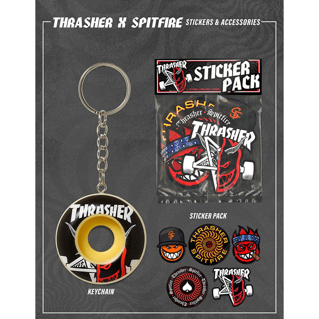 SPITFIREとTHRASHER のコラボウィールキーホルダー。■サイズ42mm ■素材100% ポリウレタン製