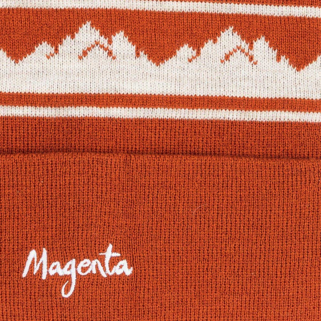 マゼンタの文字が刺繍で施されています。保温性があり、耐久性もあるアクリル生地。